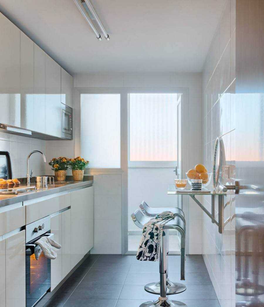 Например, выдвигающиеся из шкафа полки, которые похожи на стулья и стол. Конечно, ножек или каких-либо дополнительных подставок у них не имеется, но также отсутствуют и углубления. Они плоские, так что отлично подойдут для разделки мяса, а иногда могут заменить собой рабочую зону. Еще одно интересное решение – кухня, проходящая вдоль одной стены. Такой вариант сложен в исполнении, но довольно удобен.