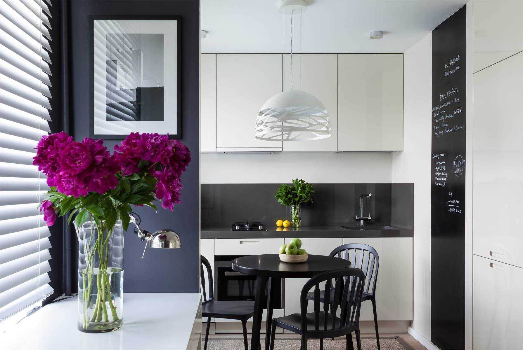 Вы можете поэкспериментировать с цветом стен на кухне. Их проще перекрасить, чем заменить мебель. Таким образом, можно быстро и дешево изменить интерьер кухни. Например, достаточно нескольких мазков кисти, чтобы сделать его минималистичным, уютным и радостным. Естественно, цвет стен должен соответствовать расцветки кухонной мебели. Темная палитра придаст светлой мебели еще больше блеска, создав элегантный контраст. В свою очередь, светлые цвета осветят кухню, придадут ей свечение. Подумайте о том, какой эффект вам важнее всего. Кухня не всегда должна быть яркой, светлой или белой. Как насчет темных элементов на небольшой площади?