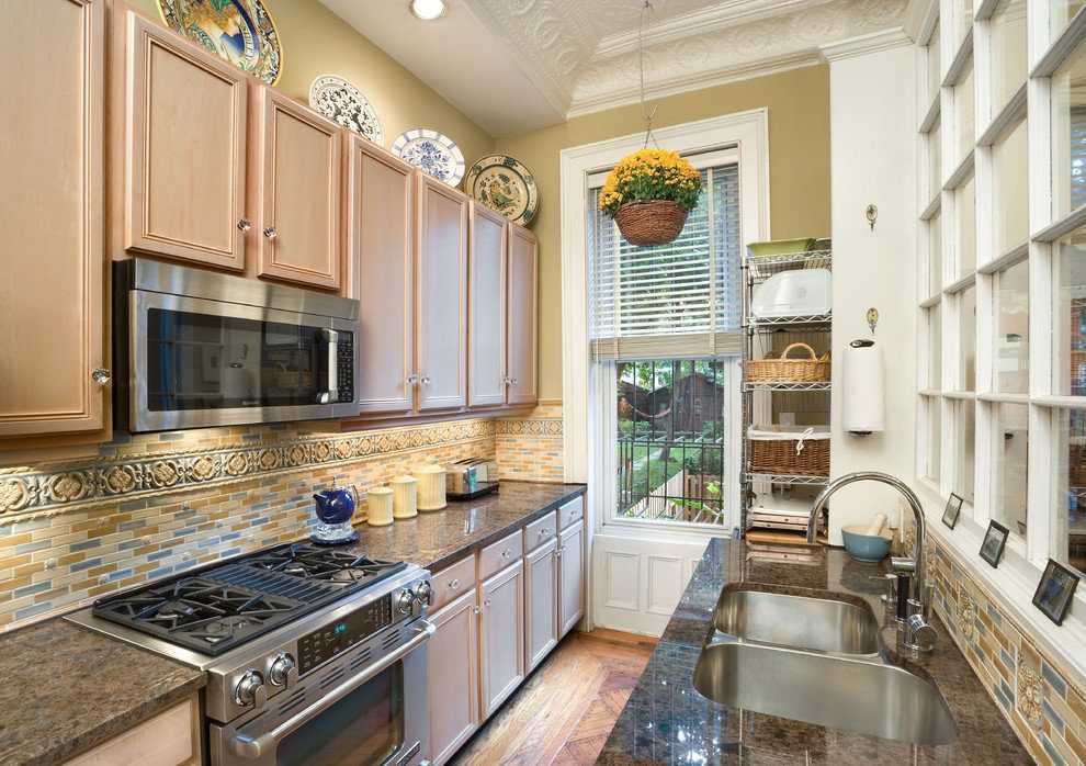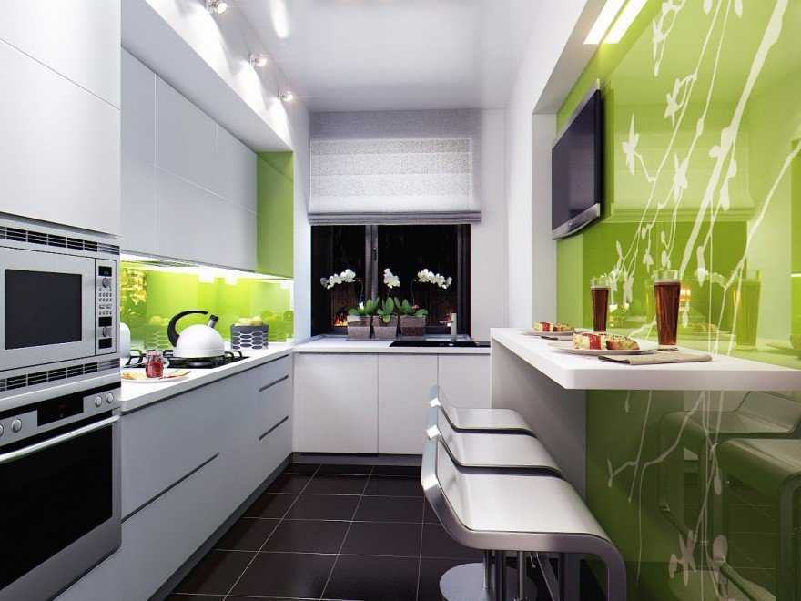 П-образный дизайн для маленькой кухни. Выразительно, объемно, функционально, но с одним большим минусом – для столовой не остается места. Мебель, техника занимают обе стены. Под окном располагается рабочая поверхность. Обеденную зону приходится выносить за пределы помещения.
