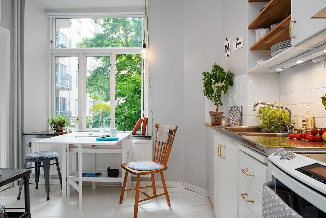 Всё больше людей отказываются от громоздких столов и стульев в пользу мебели, которая прячется в гарнитур или откидывается к стене. Использование таких элементов позволяет в нужный для хозяйки момент фактически менять свою кухню как ей удобно.