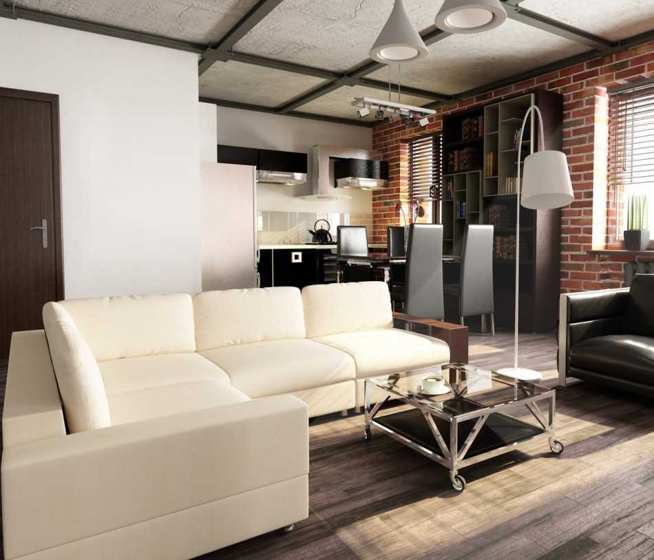 - Гостиную совмещают с кухней, рабочим кабинетом или спальней.
