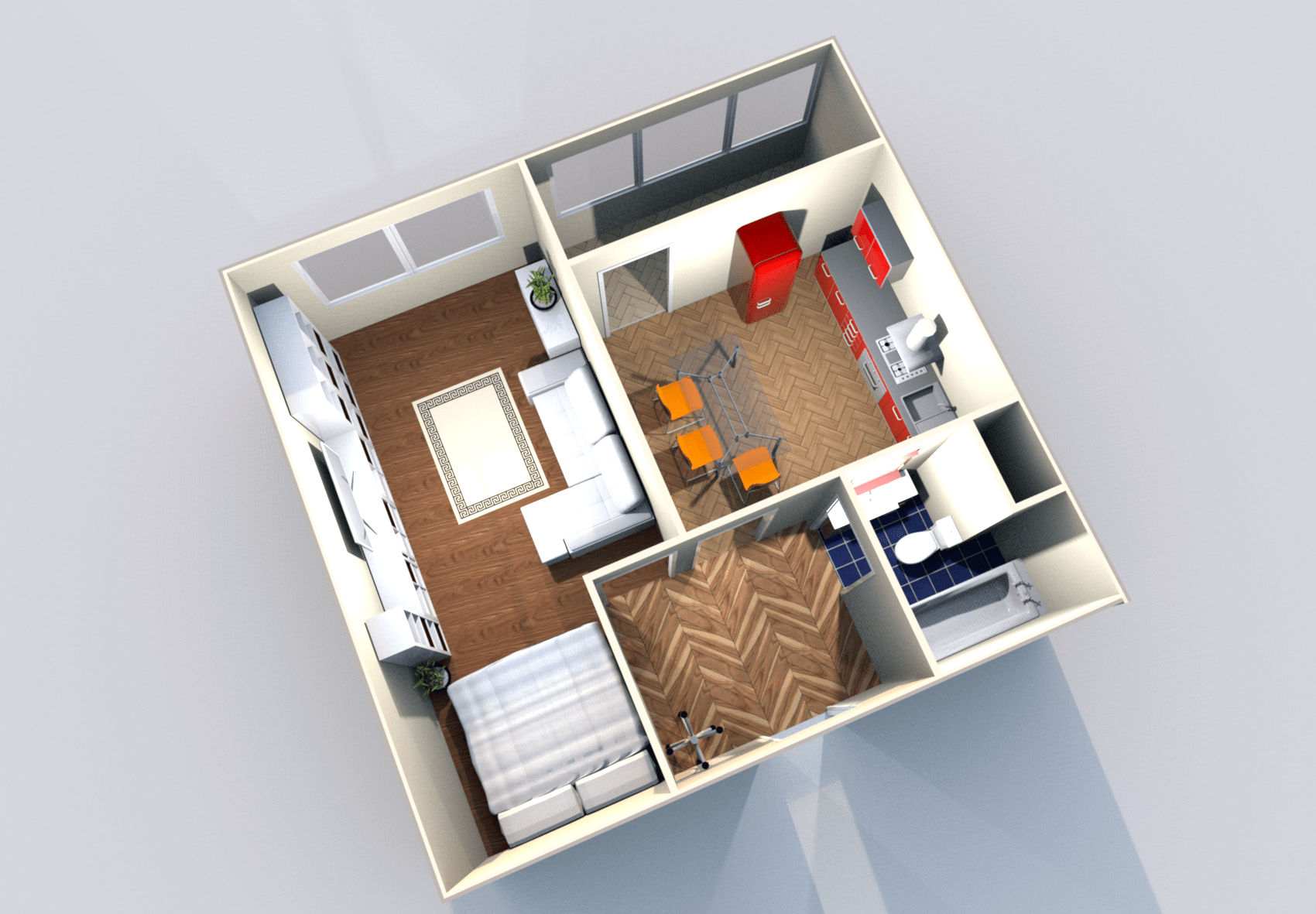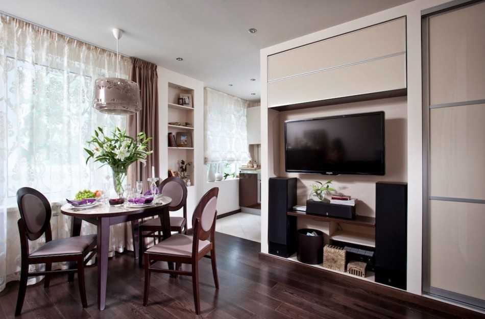 Как и в предыдущих вариантах, предпочтительнее сделать квартиру-студию. Дизайнерские приемы позволяют совмещать как отдельные предметы мебели, так и помещения. Существует решение по трансформации стен, используются приподнимающиеся раскладные кровати, убирающиеся в шкафы телевизоры, а мебель используется для хранения самых разных предметов.Стены-трансформеры в небольшом помещении
