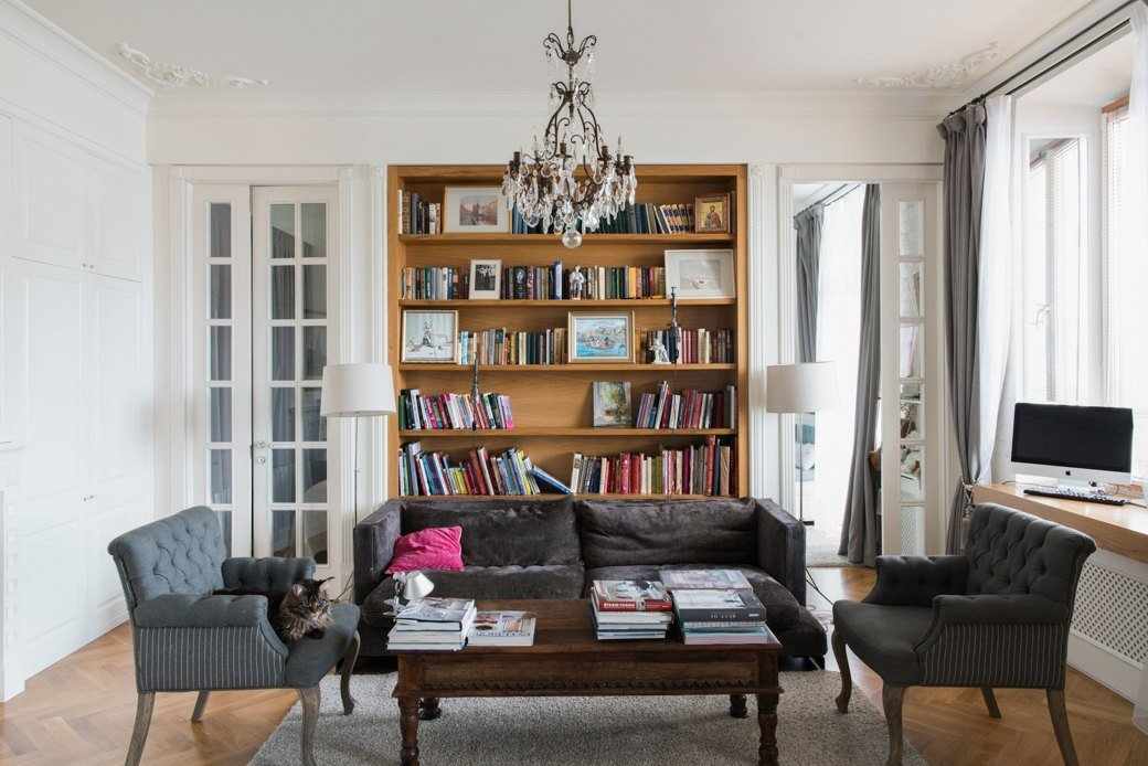 Стены декорируются картинами. Хорошо, если будет отдельный уголок под библиотеку – со шкафами из массива, уставленными книгами. Можно сделать кабинет в стиле того времени: это массивный стол, диван из темной кожи и лампа с характерным абажуром зеленого цвета.