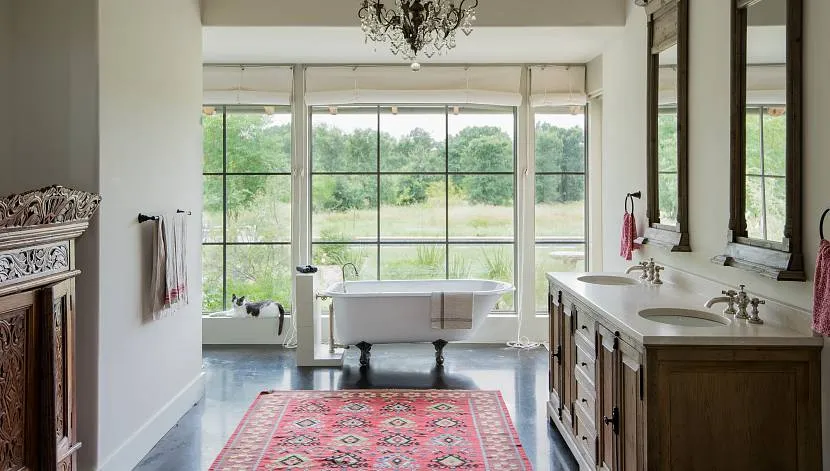 Окно в ванной, особенно если это просторная комната в частном доме, — это бесспорно оригинально и эффектно. У такой интерьерной детали есть множество плюсов: