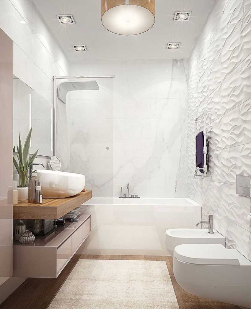 Что же касается расположения сантехники – все зависит от формы самой комнаты и стилистического оформления. Например, вытянутый совмещенный санузел, дизайн которого построен на принципах минимализма, может выглядеть более объемным и просторным, если использовать линейное размещение всех стратегически-важных приборов.