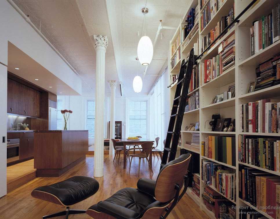Не будет идти речь об интерьере домашней библиотеки в малогабаритных квартирах. Тут просто не найдется места для книжных шкафов. Библиотека перенесется на верхний ярус, и будет представлена в антресольном состоянии.