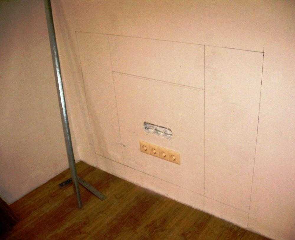 Для начала делаем чертеж, исходя из желаемого размера камина. Переносим часть разметки на стену.
