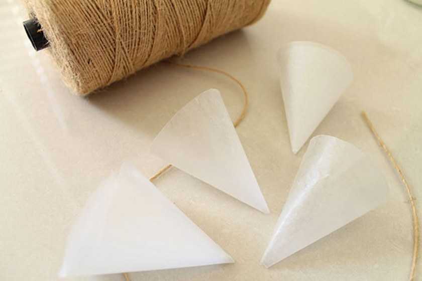 Край нити завязывается в петлю, чтобы надеть на ленту. Чем больше таких конусных цепочек, тем эффектнее будет смотреться гирлянда. Повесть её можно, закрепив ленту к потолку.