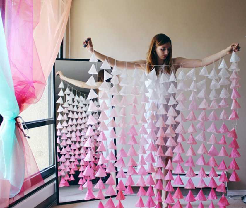 Их можно сделать из бумаги, фетра или связать крючком из ниток мулине. Или использовать гирлянды, для создания которых надо на нити приклеить бабочки, рыбки, кружочки, вырезанные из бумаги. Ещё как вариант просто подвесить много атласных лент на планку на высоте примерно двух метров.