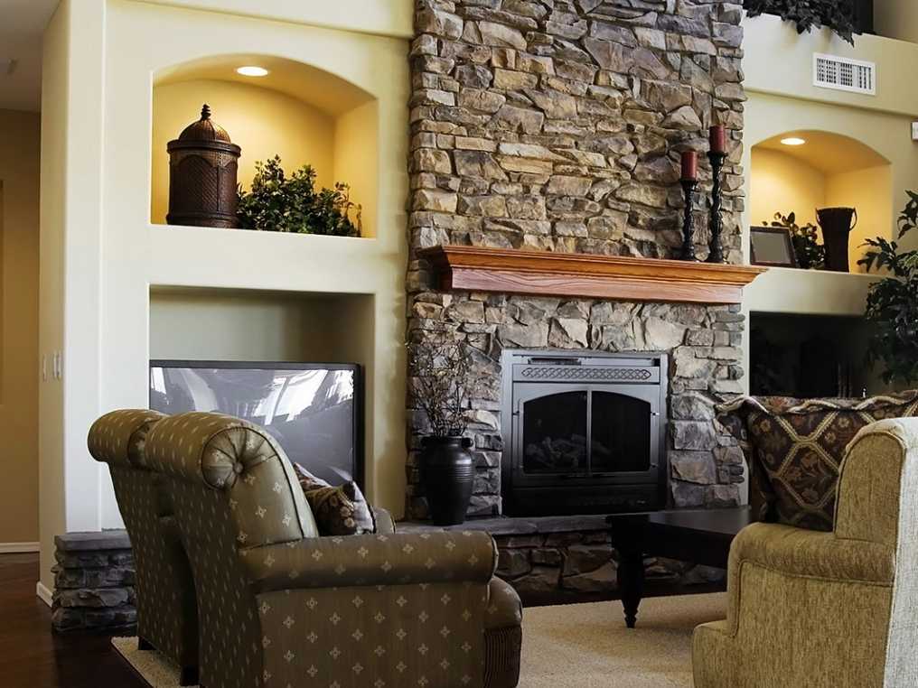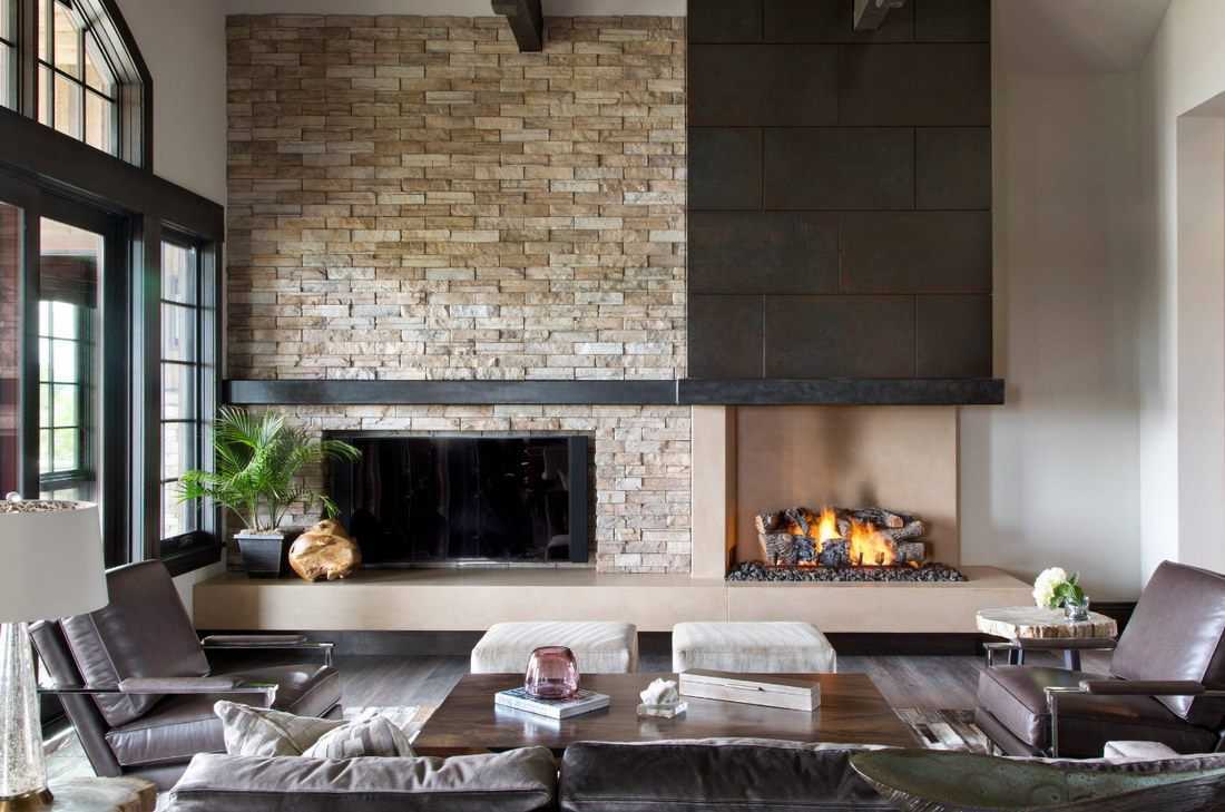 Для создания правильной атмосферы, в гостиных устанавливается камин. Он может быть декорированным натуральным камнем.