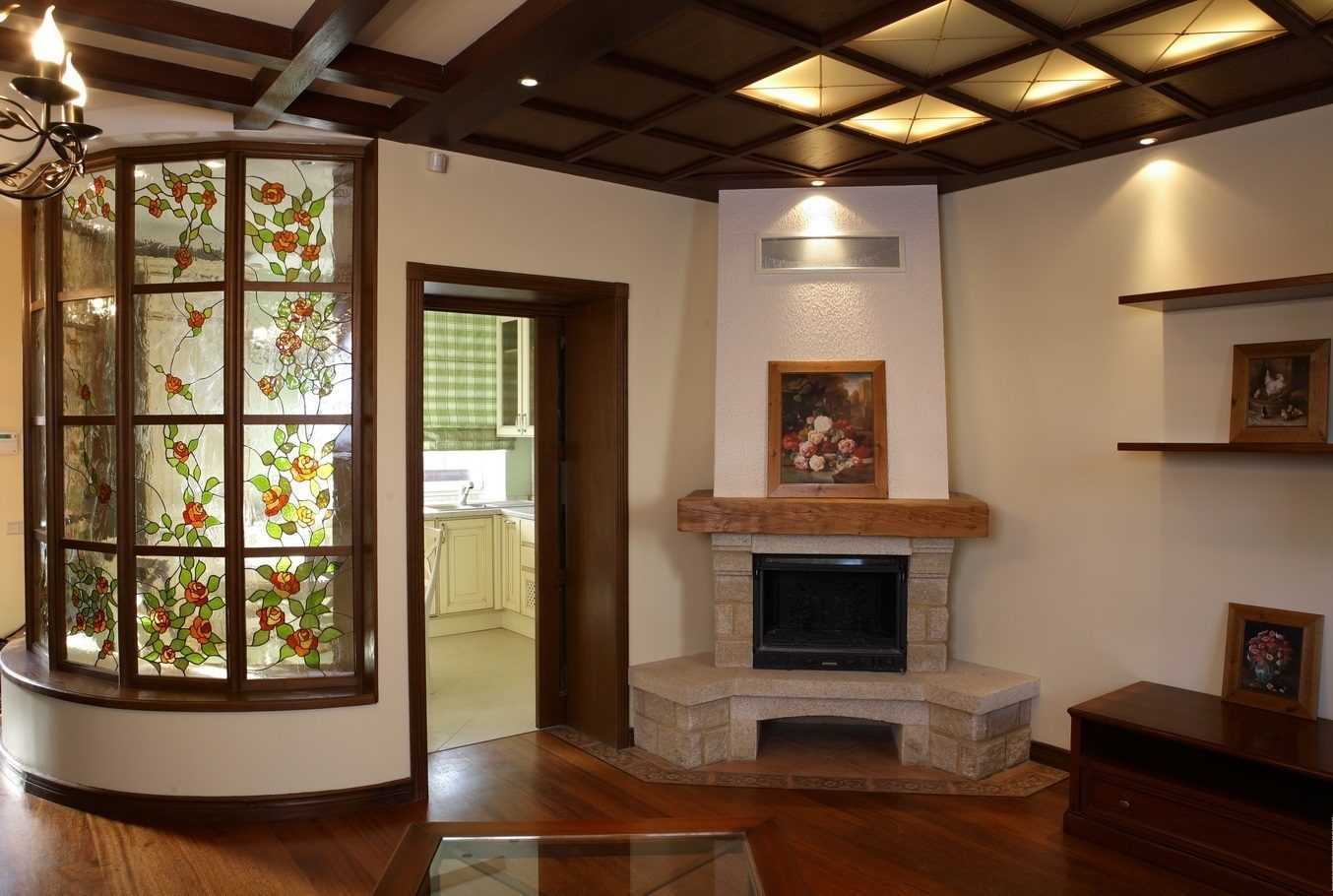 Это оптимальный вариант для гостиных, которые имеют квадратную форму. Электрокамин может стоять вдоль стены, или же занимать место в углу. В качестве декора рекомендуется использовать изделия с витражными вставками.