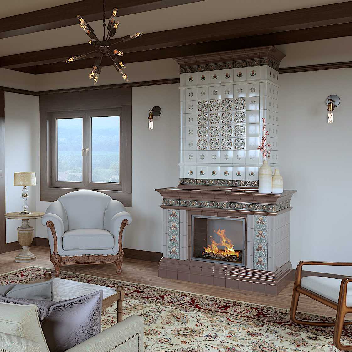 Отделка выполнена из благородного материала, чаще это хорошее дерево. Все украшено резьбой, скульптурами. Каждый элемент выдержан и отдает «стариной». Около такого камина обязательно должны быть старинные картины или хорошие репродукции.