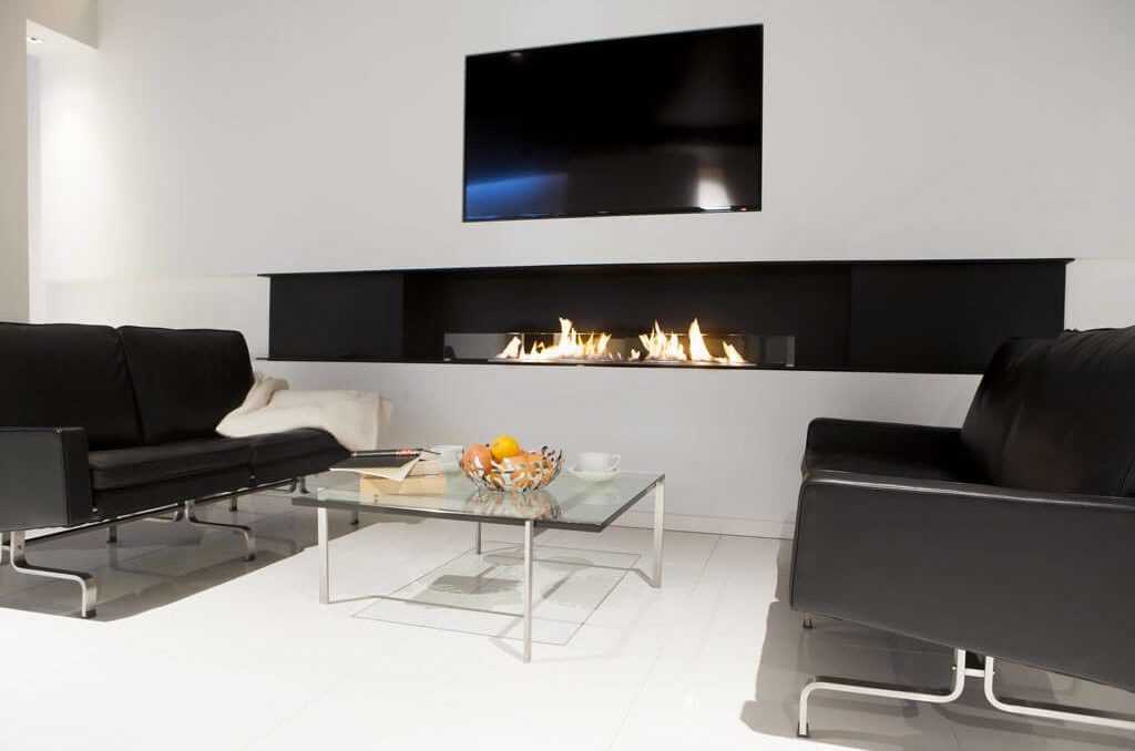 Строгие, четкие и прямые линии телевизора в сочетании с лаконичными каминными устройствами, представляющими собой лишь пламя, органично вписываются в минималистичный дизайн, в котором полностью отсутствуют лишние предметы, декор и аксессуары.
