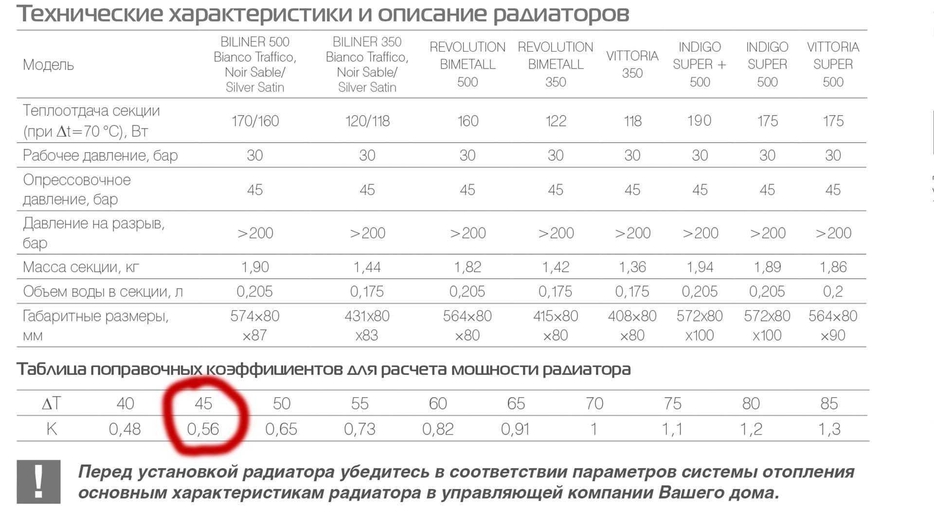 Заглянем в паспорт одного из таких приборов и видим, что при DT=45 мы имеем поправочный коэффициент 0,56. Все что осталось сделать — это перемножить мощность на коэффициент. Перемножаем и получаем мощность 100Вт с секции.