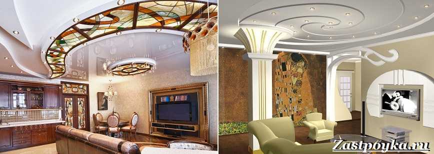 Если в модерне для стен отводится функция фона, то потолок в гостиной будет своеобразной изюминкой. Ей может стать красивая лепнина с цветочными элементами, красочные витражи, деревянные ажурные балки, зеркальные вставки, молдинги. Приемлемо создание двух уровней с различной отделкой. Потолок необязательно должен быть белый, для модерна характерна и нежная отделка розовыми, голубыми, кремовыми тонами. Стильную гостиную часто могут венчать целые картины, витиеватые узоры, орнаменты из природных элементов.