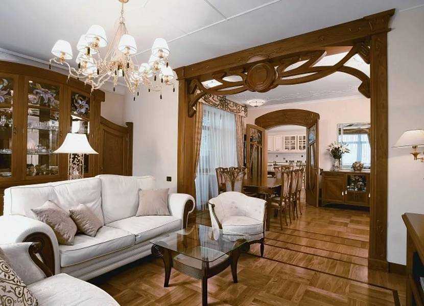 Как можно понять из предыдущего пункта, гостиная в стиле модерн отличается всевозможными извилистыми линиями, которые проглядывают в каждом элементе, будь то дверь, мебель, узор обоев или картина на стене. При этом такая пластичность удивительным образом сочетается с правильными геометрическими формами. В отличие от других стилей, модерн предлагает нам некий намек на интимность обстановки, ведь для точечного освещения выбираются торшеры и напольные светильники, дающие мягкий рассеянный свет. Люстры здесь выполняют скорее декоративные функции, являясь продолжением волн на потолке. В плане отделочных материалов модерн весьма консервативен и предпочитает исключительно натуральные материалы, традиционные для европейских стран. Это естественный камень, керамика и древесина, железо, меховые и кожаные материалы. Секрет дороговизны модерна заключается в том, что большинство предметов в комнате должны быть ручной работы или хотя бы производить такое впечатление. Уникальность просто витает в воздухе, любой аксессуар принимает томные, причудливые формы, растекаясь по поверхности, словно часы на картине Сальвадора Дали. Ощущение простора не скрадывает даже контраст, вычурные элементы декора, тяжелые плотные портьеры и мебельный текстиль. Может, за счет большого количества стеклянных деталей. Изюминкой модерна являются витражи (где угодно: на окнах, дверях, перегородках, мебели, светильниках, а также в качестве картин). 100% следование стилю – установка витража «тиффани», названного в честь его создателя Луиса К. Тиффани.