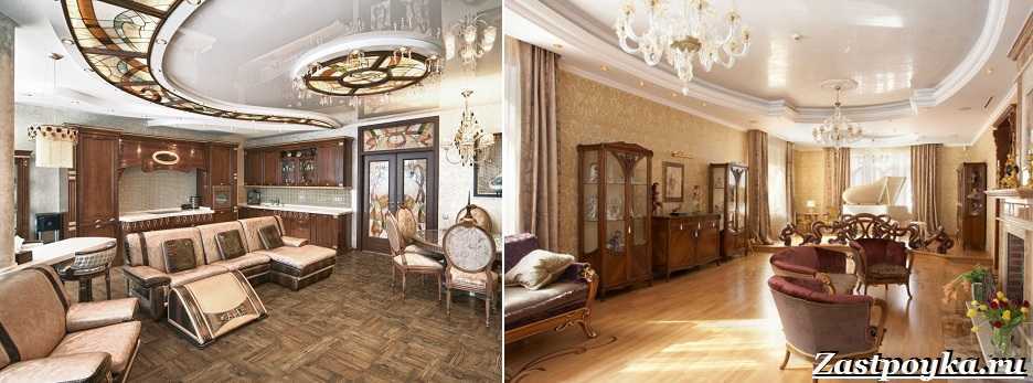 Зачастую встречается натяжной глянцевый потолок в центре гостиной, а боковые части по всему периметру матовые, с вмонтированными галогеновыми светильниками.