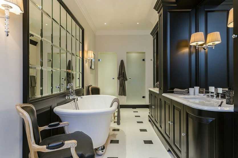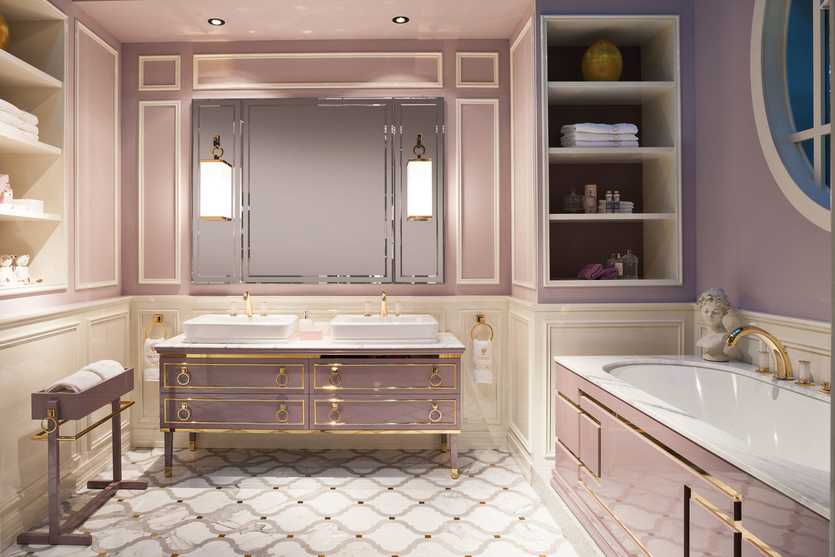 Это самое открытое к экспериментам направление: вспомните эклектичные интерьеры Жана Луи Денио. В ванной, обставленной в духе французской классики, оригинальный диван с витиеватыми ножками может повстречаться с современным футуристичным светильником – и это будет вполне гармоничный тандем.