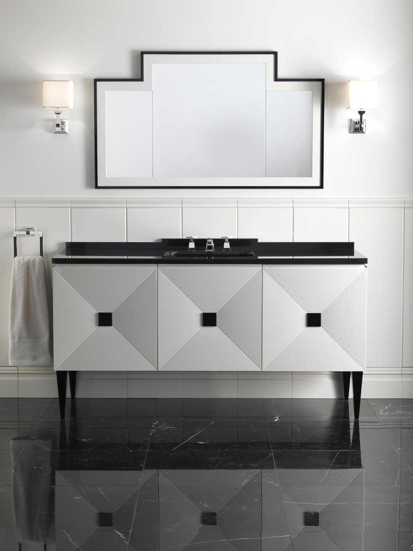 Для ар-деко характерны вытянутые, ломаные орнаменты, контрастная отделка, джазовые мотивы, много блеска, поэтому и санузлы динамичные, нарядные. А вот плавные линии, выгнутые ножки кабриоль оставьте для других направлений.