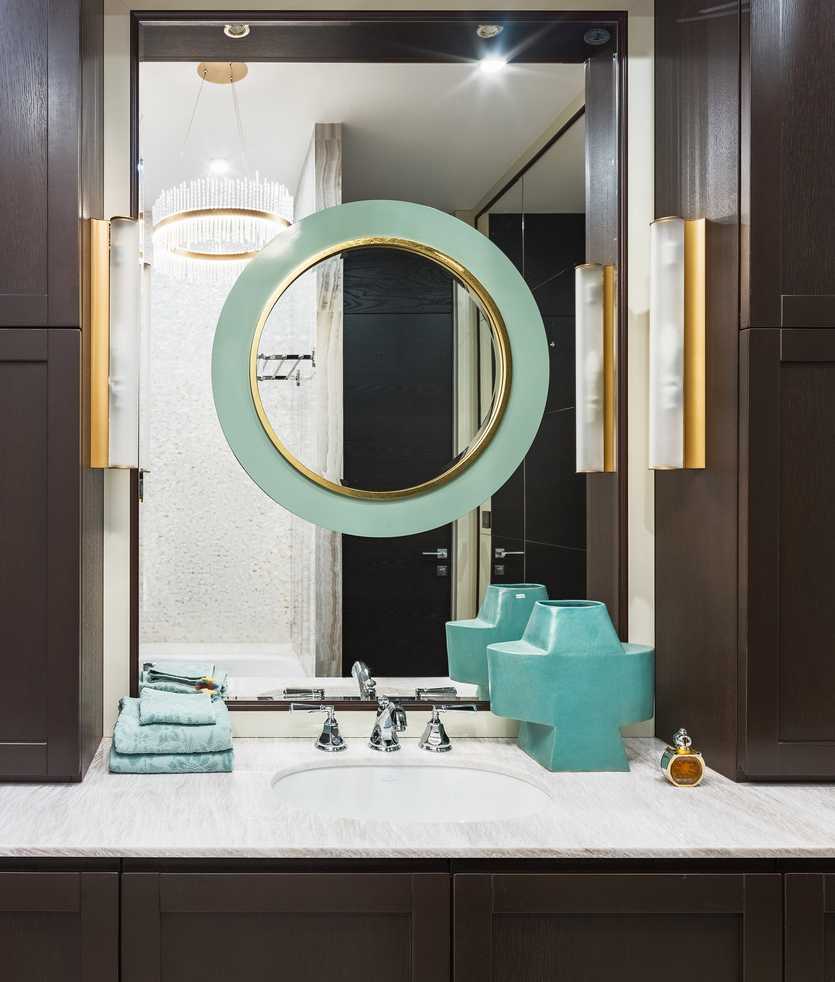 Зеркала в ванную классического стиля обрамляют в багет с богатой резьбой и позолотой. Они считаются одной из главных декоративных «изюминок». Альтернативой служат зеркала, занимающие всю стену над умывальником, по обеим сторонам которых располагаются полки или вертикальные пеналы.