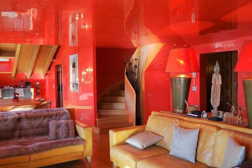 Чтобы усилить экстравагантный эффект, можно отказаться от контрастных вливаний цвета. Пол стены и потолок в едином оттенке размоют визуальные границы пространства.