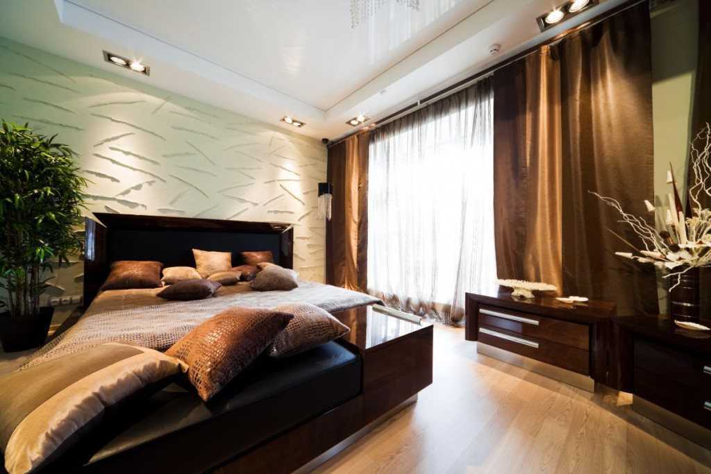 Для моно-интерьера спальни хорошо подходят нейтральные светлые гаммы, а также расслабляющие приглушенно-зелёные и синие тона. Яркие краски не рекомендуются.