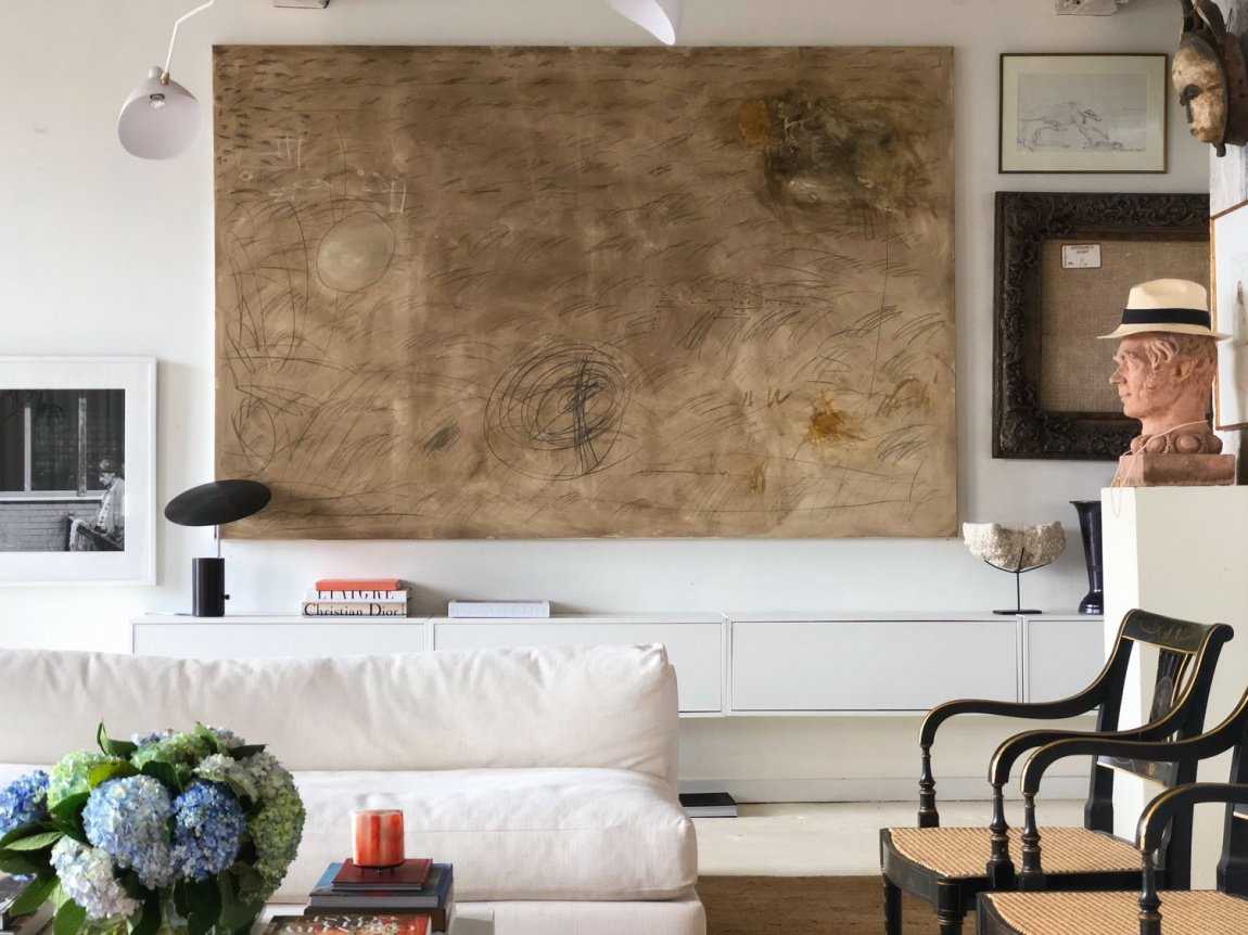 Идеальный цвет фона — белый. Он универсален и подойдет для любого произведения. В самых популярных выставочных пространствах в белый цвет окрашивают все плоскости, создавая так называемый «белый куб». Понятно, что в жилом интерьере это не рациональная мера. В качестве цвета фона можно использовать и темный серый, и черный, а также глубокие и не слишком яркие цвета. Если вы отталкиваетесь от заранее имеющегося предмета искусства, у вас есть преимущество: вы можете подобрать наиболее выгодный оттенок фона и даже использовать для него цвет, присутствующий в гамме картины.