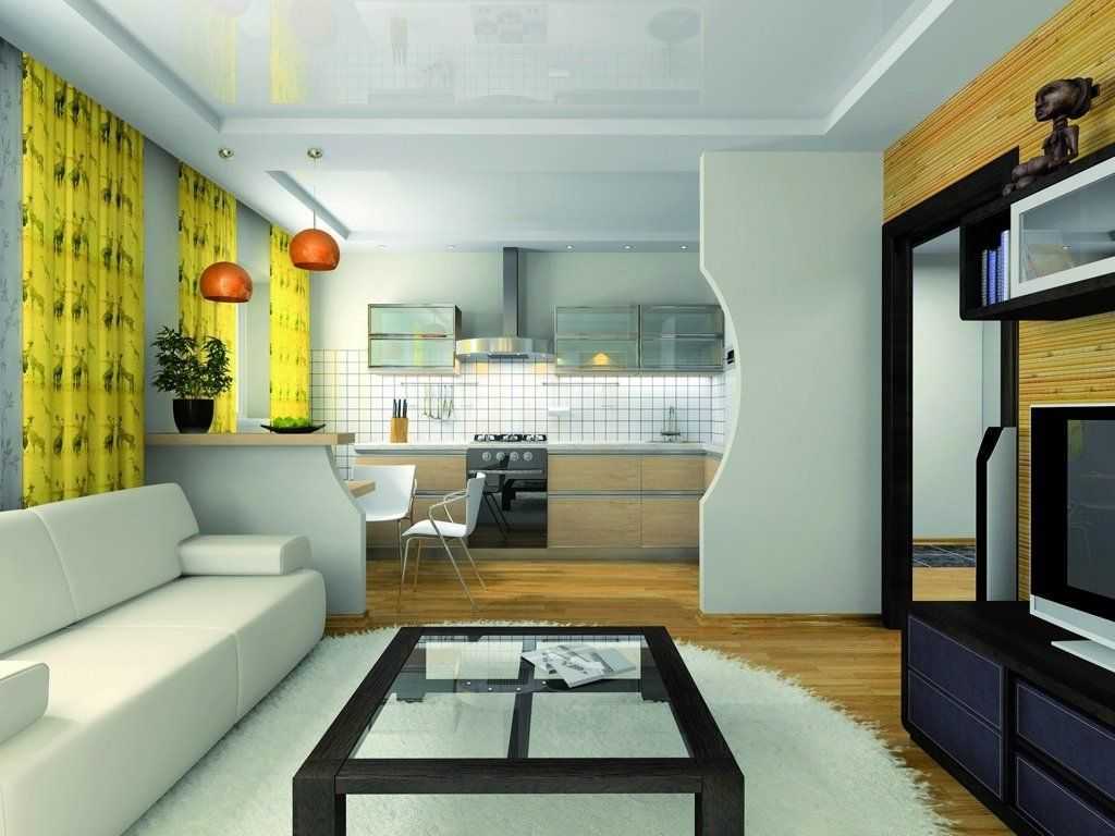Интерьер гостиной, совмещенной с кухней, принято разделять на функциональные зоны – кухонную, гостиную и столовую. Благодаря зонированию вы отделите царство хозяйки от королевства гостей и родственников, скроете от посторонних глаз процесс готовки и сможете по привычке уединиться на кухне.