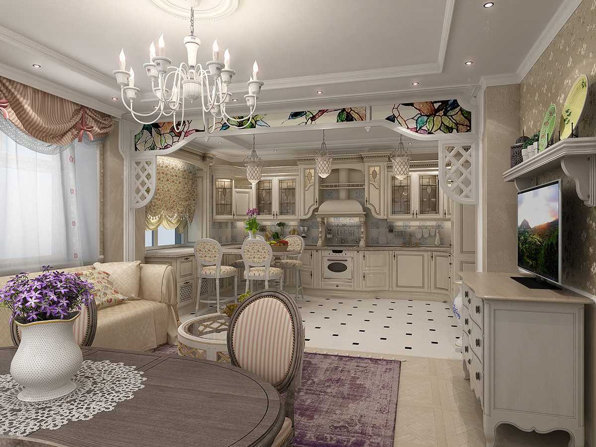 Оформление потолка чаще всего является цветовым продолжением стен, но есть и более современные варианты – комбинированные или двухуровневые потолки с ПВХ или сатиновыми полотнами. Глянцевое или фактурное покрытие гармонично дополнит кухонный гарнитур и обивку мягкой мебели в гостиной.