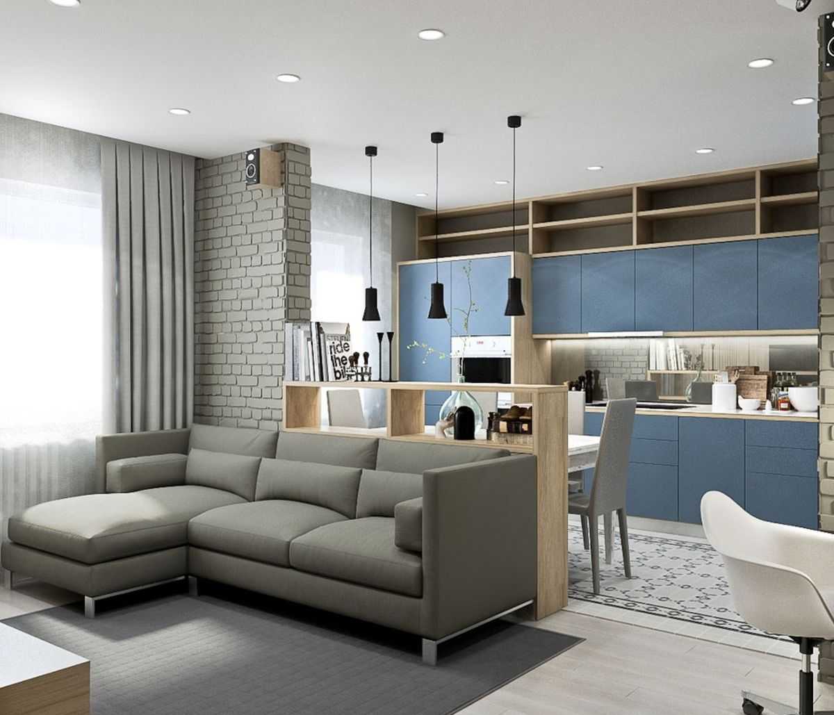 Для визуального разделения кухни, совмещенной с гостиной используют: