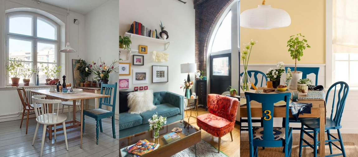 Отказываемся от стандартных мебельных гарнитуров, собираем их самостоятельно из разных ингредиентов. Вокруг стола могут собраться самые разномастные стулья, а чтобы картинка смотрелась гармонично, такие элементы должен объединять цвет, фактура, форма или эпоха.