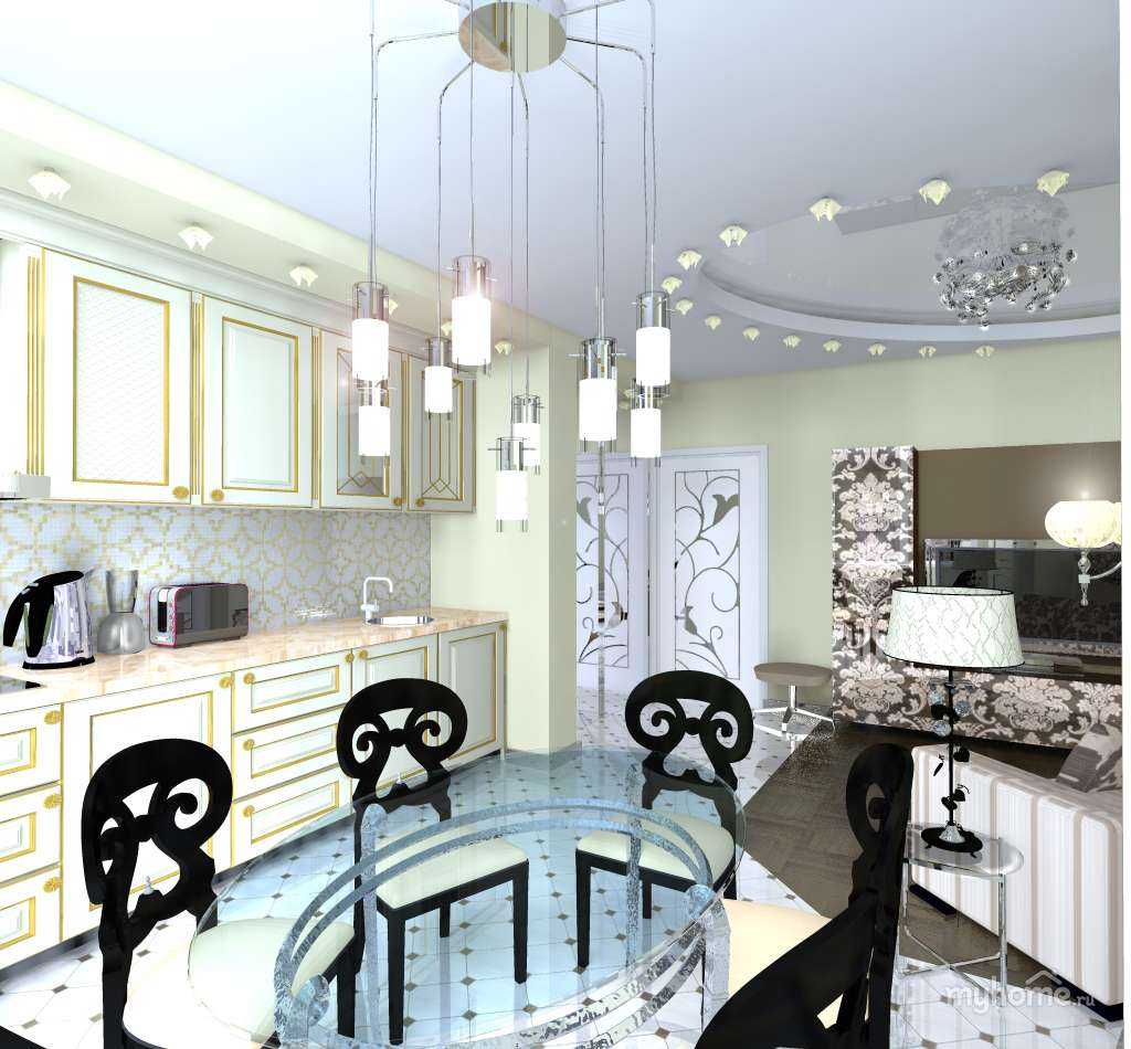 Спальня в стиле барокко, а гостиная, кухня и ванна в стиле хай-тек.