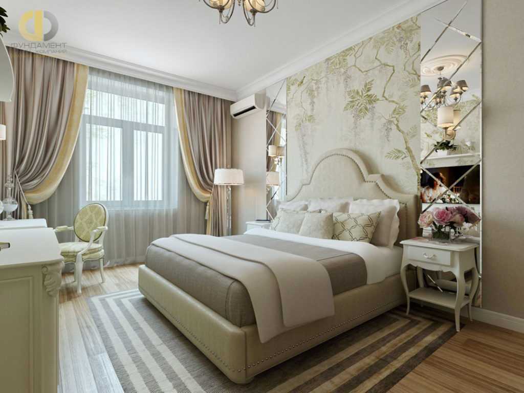 На фото интерьер спальни и гипсовая 3д плитка с волнистым узором на стене.