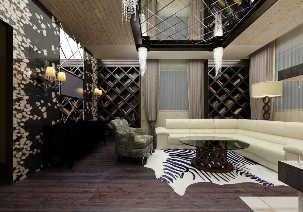 Глянцевая плитка на потолке в гостиной загородной резиденции