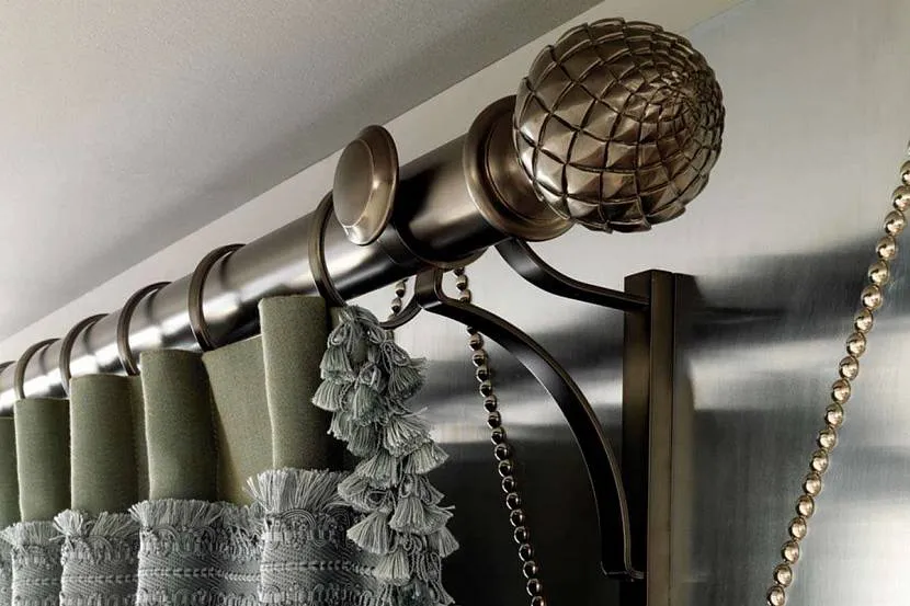 короткий потолочный карниз не подойдет. Выбирайте его на 20-25 см шире окна. Это позволит визуально немного увеличить проем. Края трубчатого карниза можно украсить наконечниками;