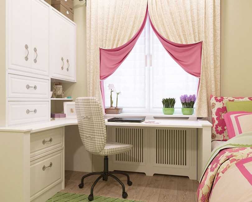 - Маленькую комнату желательно не перегружать и подобрать легкие многослойные варианты. Повесьте карниз у самого потолка, и гардины визуально вытянут пространство. Что касается расцветки, то правильно будет остановиться на светлых однотонных моделях, можно с крупным узором. Визуально увеличить площадь поможет такой прием: карниз должен быть значительно шире величины окна, лучше на всю стену.