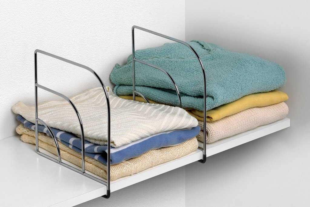 Следующая проблема — грамотно сложить вещи (футболки, свитера, кофты) по стопкам. Если одежды очень много, и стопок получается несколько, велика вероятность, что они будут заваливаться и падать. Обычно такие конструкции выглядят хорошо до того момента, пока вам ни понадобится какая-нибудь кофточка из середины (тут уж вы, как фокусник, будете стараться вытащить ее, как скатерть из-под посуды, не повалив ничего). Гениальный помощник в таких случаях — это разделитель одежды. На Ebay такая штука стоит около 54 $.
