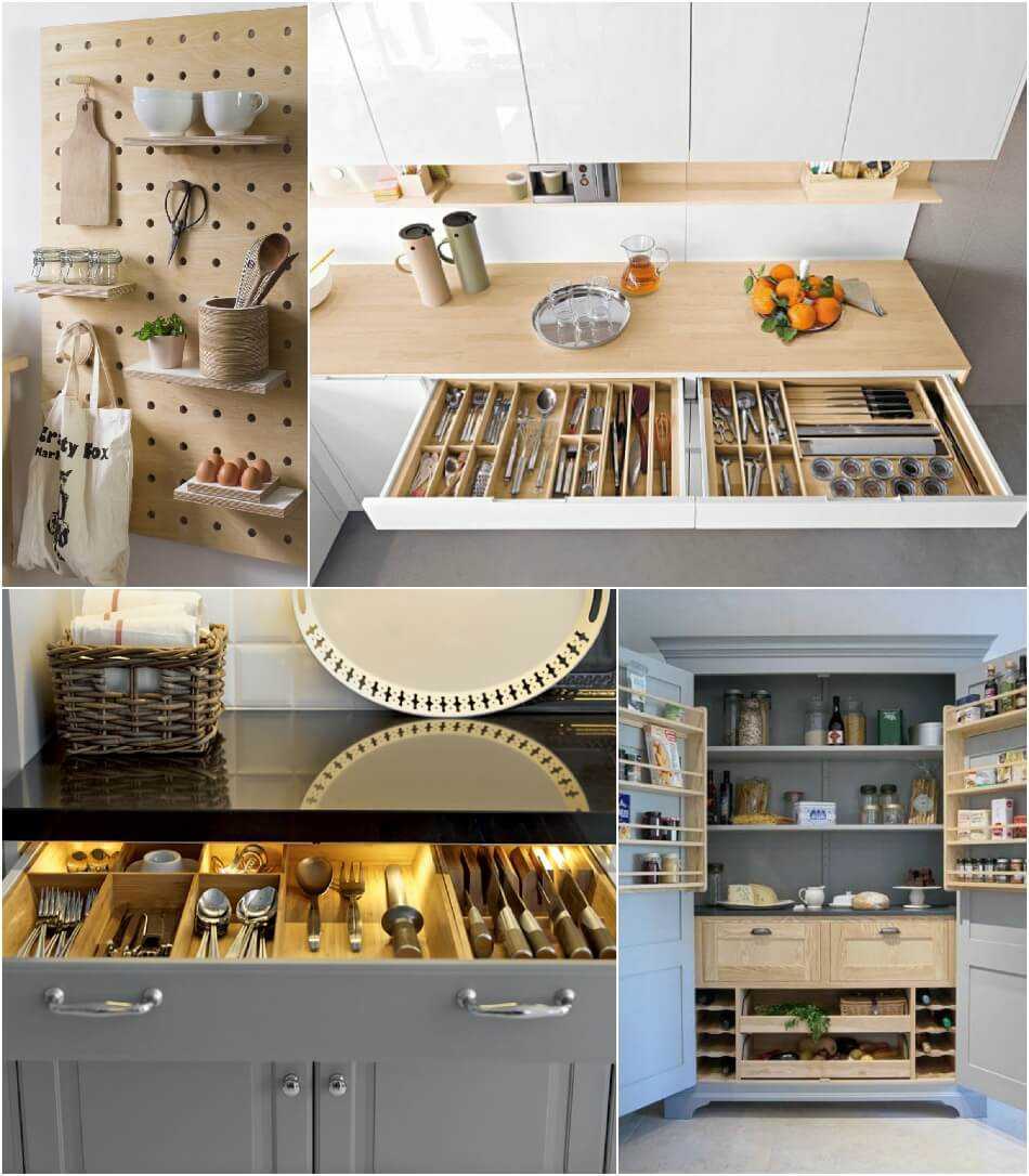 Важно организовать хранение мелких предметов таким образом, чтобы они были спрятаны от посторонних глаз, но были в постоянной доступности. Такими скрытыми местами для хранения могут быть внутренние стороны дверок кухонных тумб или подвесных шкафов