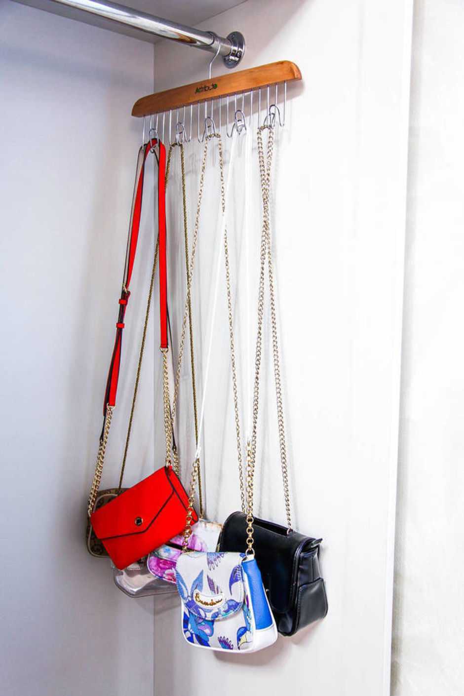 Для большого количества сумок вам понадобится обычная вешалка. Подходит как экземпляр для одежды, так и вешалка для ремней (я храню таким способом маленькие сумочки на ремешках). Сумкам нередко выделяют нижнюю полку в шкафу, где аккуратно складывают их «плечом к плечу»,