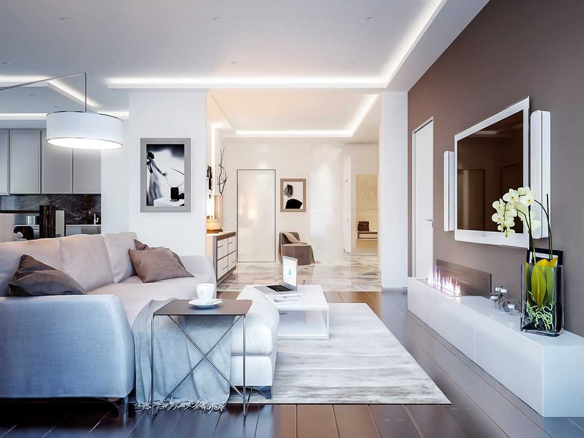 В небольших квартирах в гостиной освещение может быть построено исключительно на использовании точечных светильников и светодиодной ленты.
