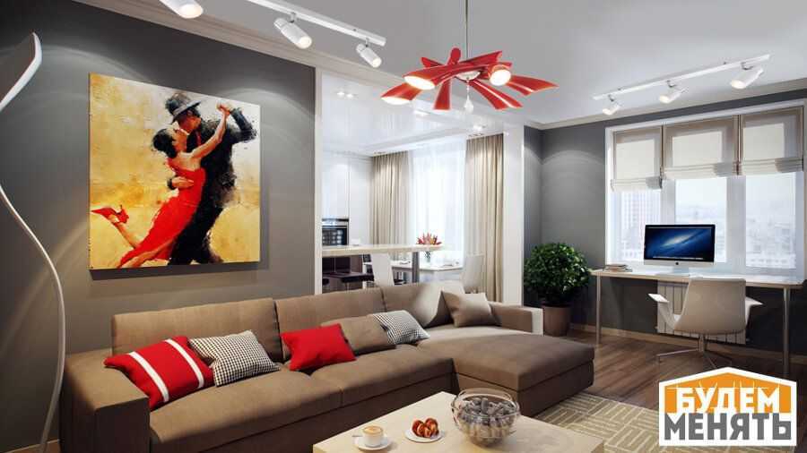 Потолочные светильники можно заменить на споты, которые двигаются по шине. Такая система легко монтируется и может освещать сразу несколько точек, например, картину, диван, рабочий стол, ведь споты можно передвигать по шине и направлять в любую сторону. Что касается торшера у дивана – он позволит уютно устроиться, например, с книгой или рукоделием.