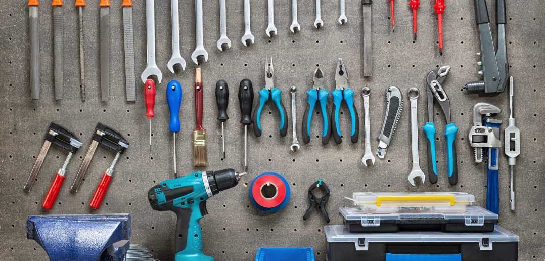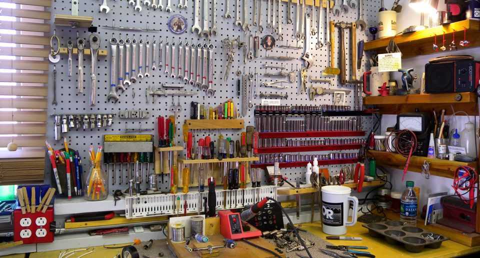 Щит для инструментов можно сделать самостоятельно — в соответствии с вашим набором инструментов и имеющимся пространством, а для фиксации инструмента в продаже можно найти множество специальных крепежных изделий. Многие инструменты уже продаются в контейнере для хранения. Даже если это просто картонная коробка, она неплохо послужит некоторое время. Если инструмент какое-то время не будет использоваться, убирайте их, особенно в конце рабочего дня.