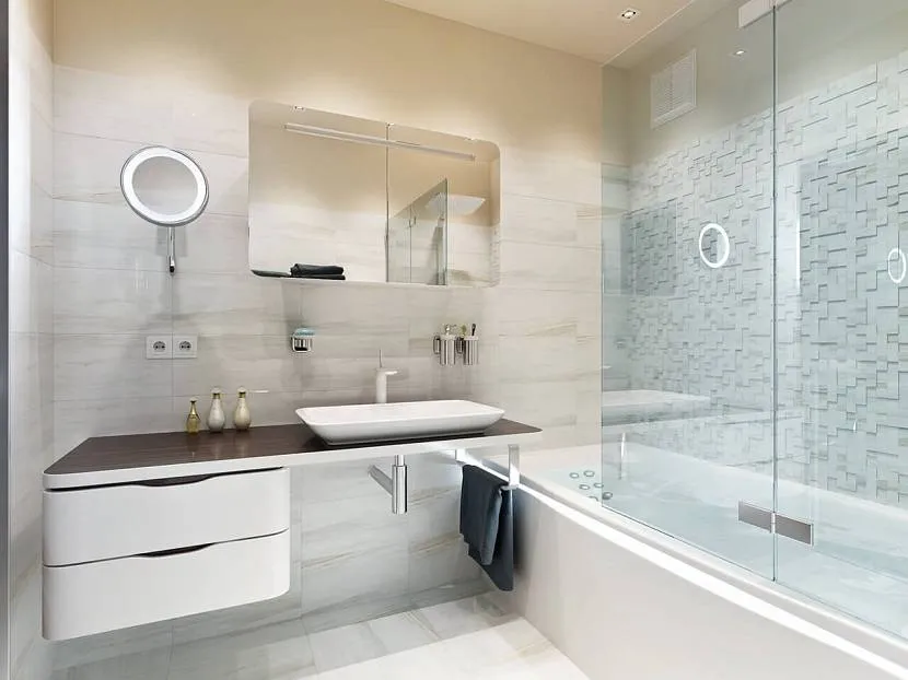 - Минимализм предполагает выделение каждому предмету интерьера нескольких функций. Например, встраиваемая сантехника, зеркало с подсветкой, шкаф с зеркальной дверцей, пуф и корзина для белья в одном и многое другое.