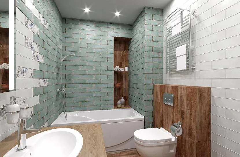 Цветовые акценты – прекрасная возможность для зонирования пространства . Например, уголок с ванной или душевой кабинкой можно выделить зелеными, голубыми, бирюзовыми оттенками, а место умывальника выделить контрастным цветом.