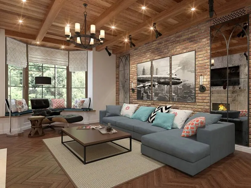 Дизайн гостиной в стиле лофт – это большое количество металлических конструкций, труб, потертости на полу и кирпичные стены.