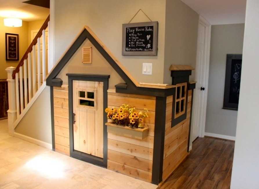 Если территория вокруг дома не позволяет разместить детский домик, то можно соорудить его внутри. В какой-то степени такое решение даже лучше, так как им можно будет пользоваться круглый год, а не только в теплое время года. Также домик будет защищен от воздействия неблагоприятных факторов, поэтому его срок службы значительно увеличится.