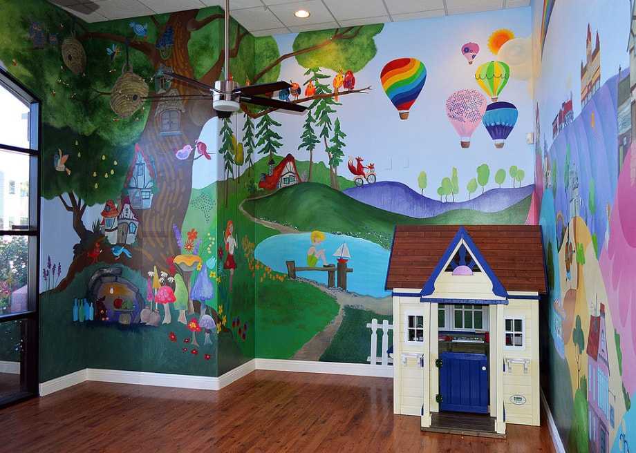 Для пола лучше всего применять практичные материалы – линолеум, ламинат. Они хорошо моются и тёплые на ощупь. Дети любят полежать на полу, поэтому в качестве напольного покрытия можно использовать ковролин, но пролитую краску на нём будет отмыть уже сложнее.