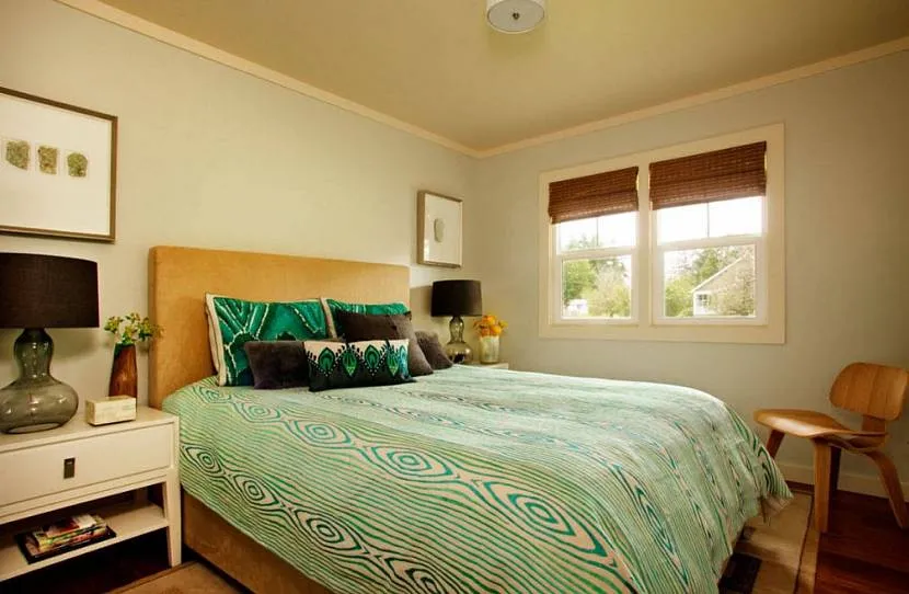 - Изделие выбирают под цвет стен спальни. Наиболее актуально данное правило для помещений небольшой площади, в которых монохромный декор позволяет визуально увеличить пространство. Покрывало необязательно должно быть такого же цвета, как стены, достаточно использовать единую гамму. Например, в бежевой спальне будет уместным молочное, светло-коричневое, светло-золотистое покрывало. Помещения с окнами на северную сторону рекомендуется декорировать теплыми цветами. В солнечной комнате можно использовать холодные тона;