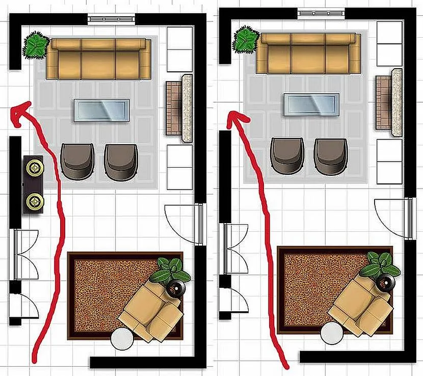 - Передвигание мебели не должно нарушать принятых пропорций, чтобы не получить нефункциональную обстановку. Стандартные пропорции изучают заранее. Например, что между двух диванов должно быть не меньше 1м. и 10см., а в прихожей должно быть не менее 0,5м. свободного места.