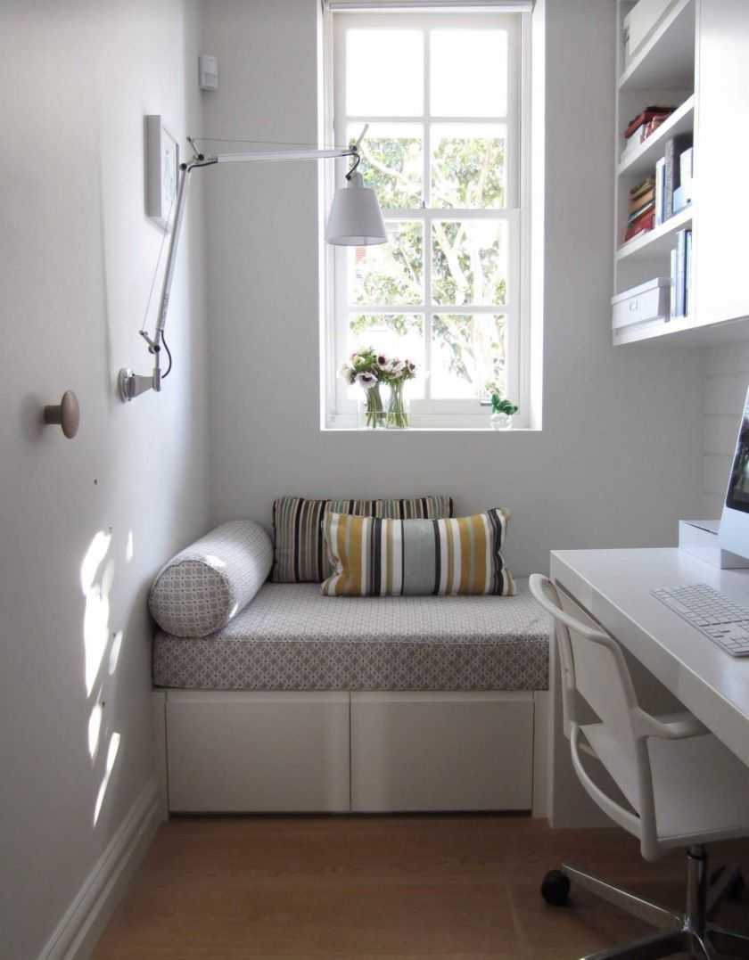 Для малогабаритных квартир устанавливают встроенные или модульные шкафы. Комод в крохотных комнатах не ставится, его можно заменить открытыми полками или выдвижными шкафами шкафа. Также можно вместо стандартного спального места, установить диван-тахту с подъемным механизмом. У него нет спинок и подлокотников, что позволяем трансформироваться в полноценную кровать. К тому же там имеется много места для постельного белья.